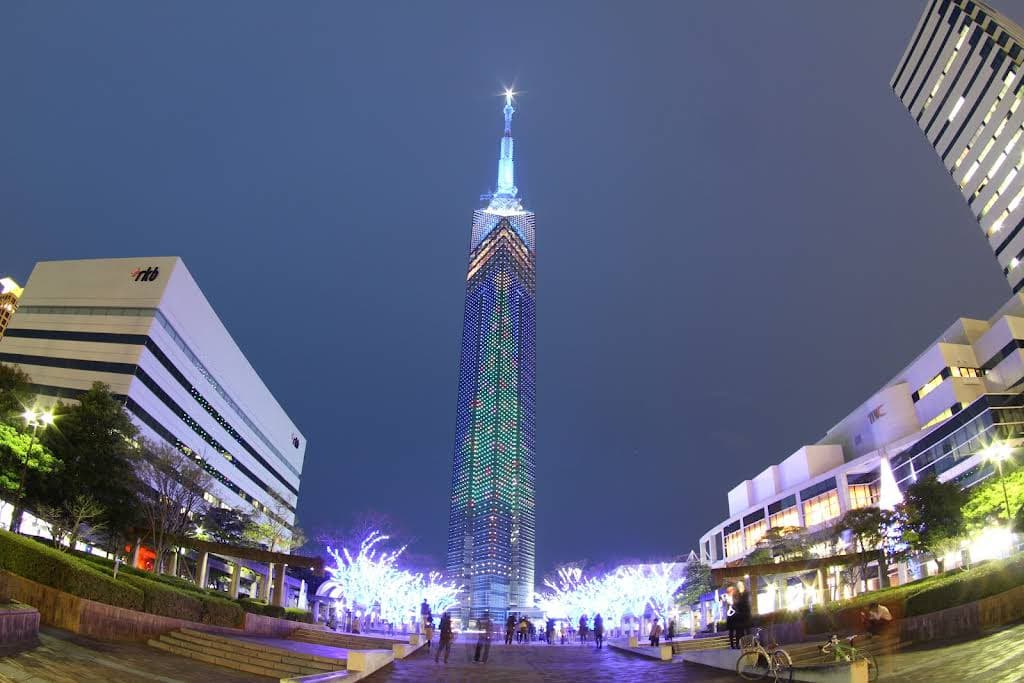 福岡塔高234m,是日本第一高的海濱塔,最上層展望室位於地上123m,可一覽博多灣、百道濱海岸線與市區天際線,夜景更入選「日本夜景100選」。1989年作為「亞太博覽會」紀念建築落成,塔身以三角形截面與鏡面外牆聞名,四季夜間都有主題燈光演出。